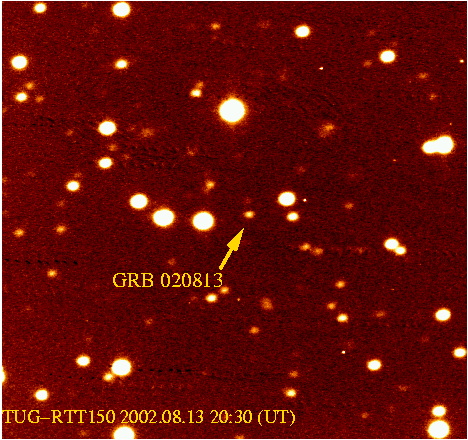 GRB020813 DDS-2 images prior to the burst. 27 minute composite exposure centered around 20:30 UT 9x180 sec exposures (total of 27 minutes) centered at 2002.08.13, 20:30. R=20.0+/-0.2, using USNO-A2 magnitude estimates. (GCN #1488)
