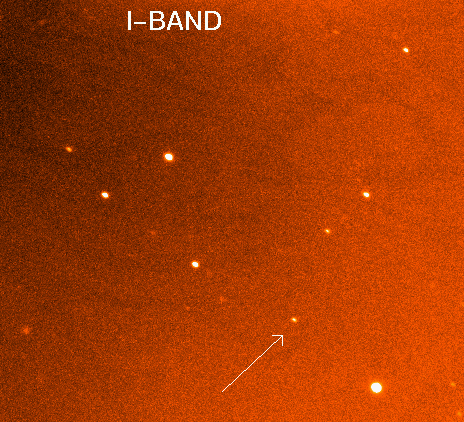 GRB021004 900 sec. R-band image of the burst. Click to enlarge V and I band images click click 04.10.2002 UT start exp_tim band magnitude 19:48:09 900 s R 17.82+-0.03 20:08:25 600 s I 17.18+-0.04 20:20:19 1200 s V 18.19+-0.11 (GCN #1580)